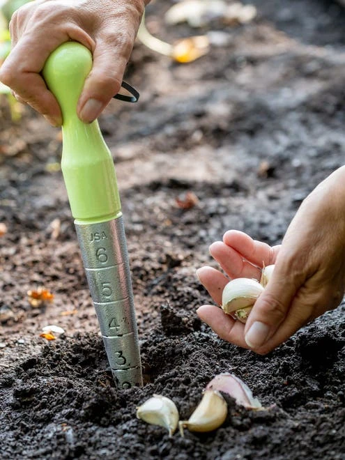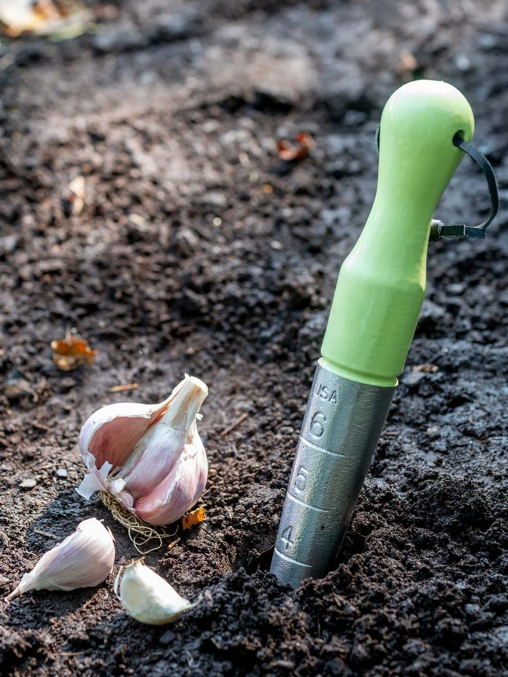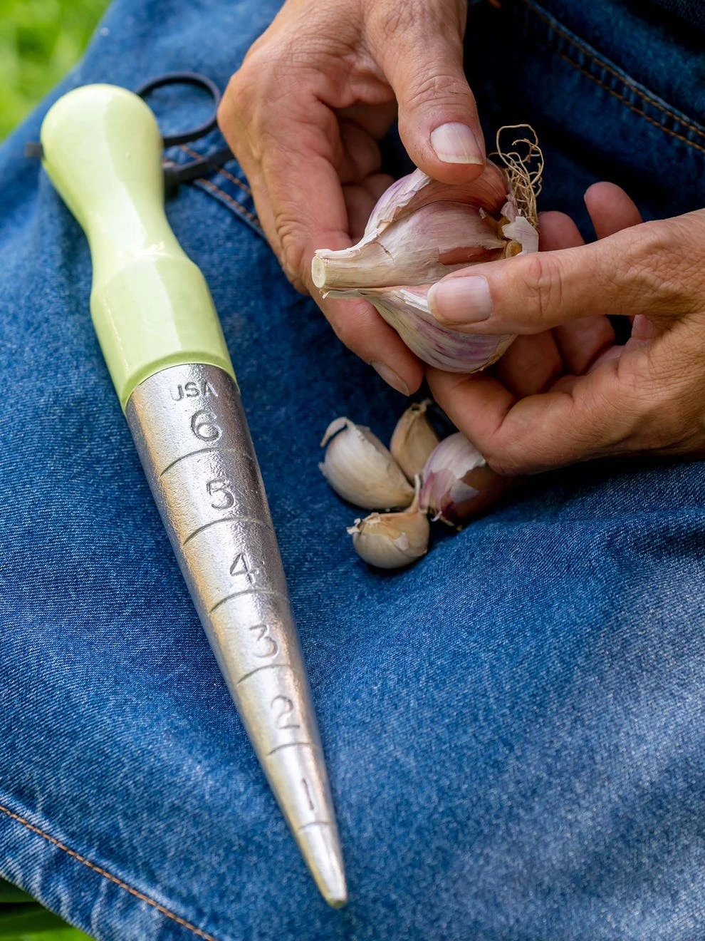 A high-quality dibbler or bulb planter like this one is among the handiest garden tools! Made in the USA from commercial-grade aluminum, this solid one-piece casting is built to last a lifetime. Use the 12″ Burpee American Cast Dibbler to effortlessly plant flower bulbs, garlic and onions with just a few spins of the handle. The 1” to 6” depth indicator marks on the tip make it easy to plant to the perfect depth, while the comfortable shift knob handle design reduces any stress on the hands and wrists. You can also use the dibbler to poke holes in the soil for sowing larger seeds like corn, beans and peas. Lifetime guarantee.