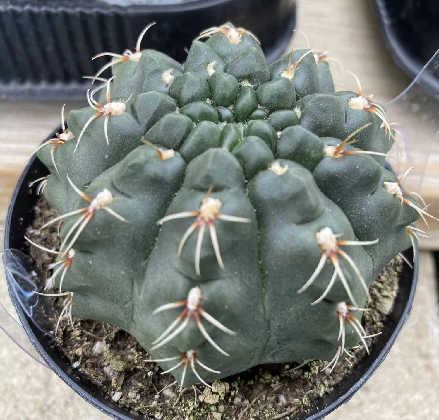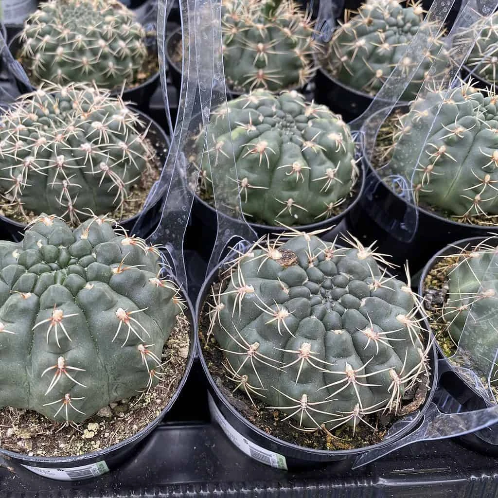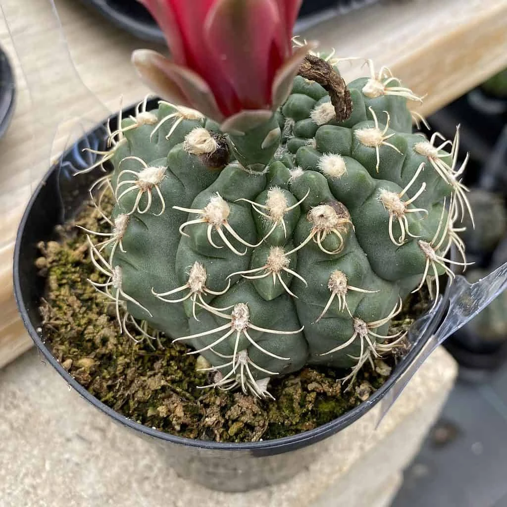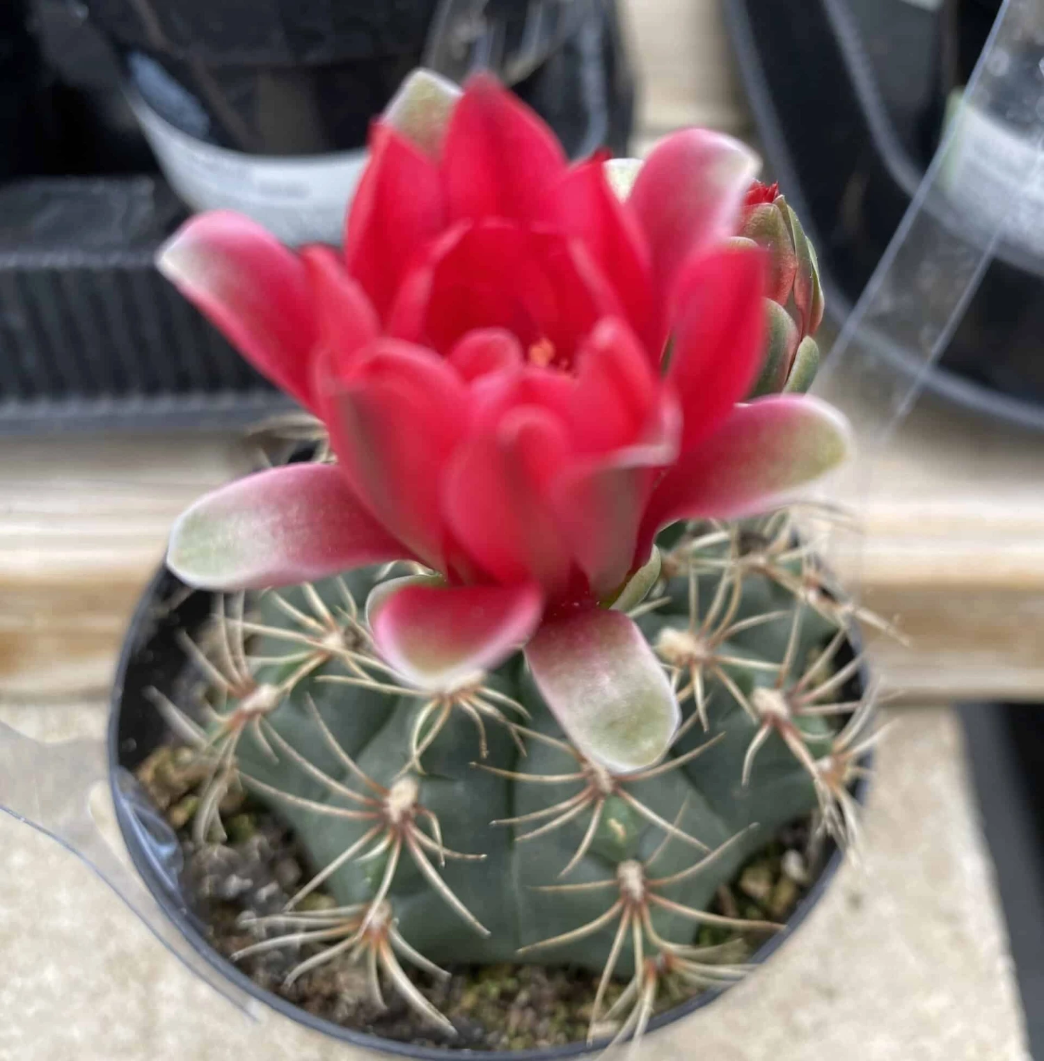 The Chin Cactus or Gymnocalycium Baldianum is native to Argentina. It is a dark green, semi flattened globular species that gives it the appearance of a chin, with spines along shallow ribs. It blooms in spring to early summer. Its flowers are funnel shaped and form at the end of spherical stems that can be up to 5″ in length, while the flowers are 1’5″ in diameter. Flowers are a range of colors from white, light pink, red, hot pink, coral or salmon. It reaches a height of 4″.
