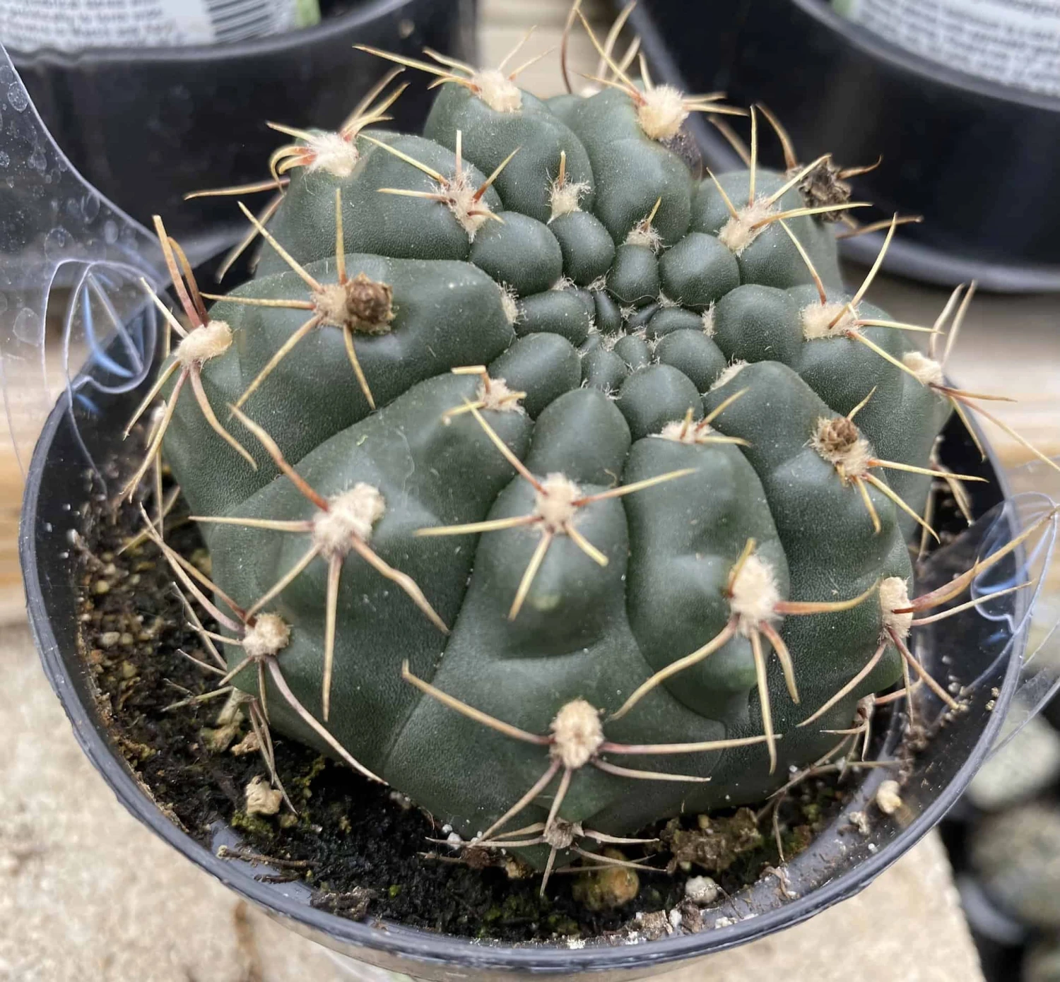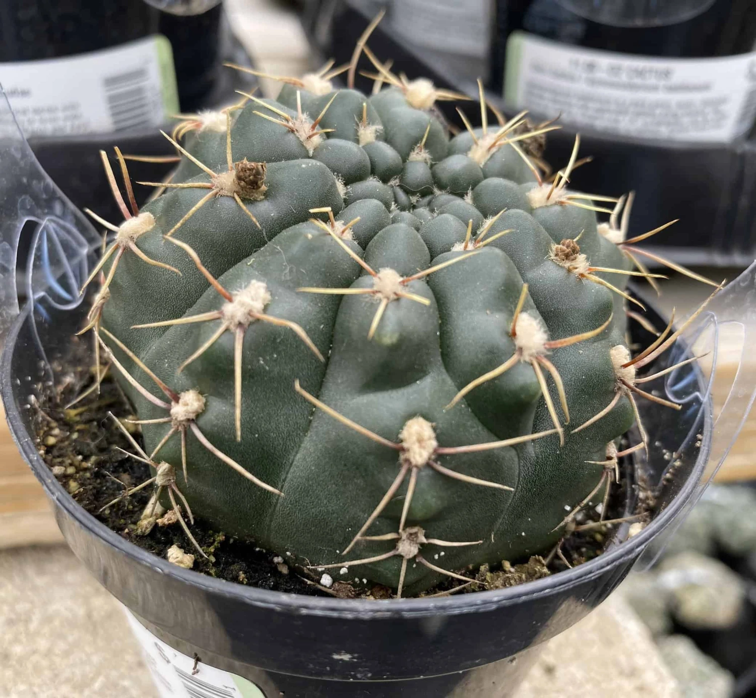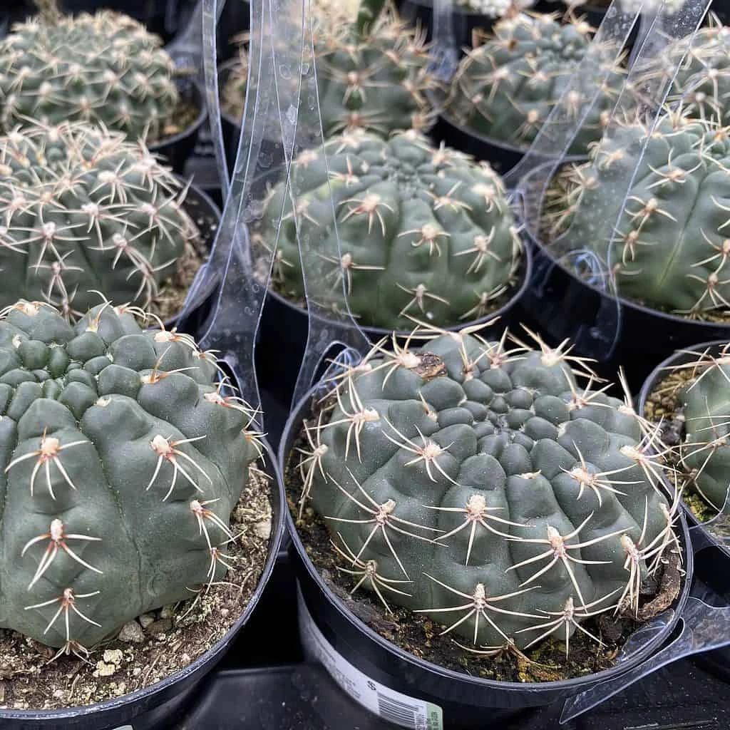 The Chin Cactus or Gymnocalycium Baldianum is native to Argentina. It is a dark green, semi flattened globular species that gives it the appearance of a chin, with spines along shallow ribs. It blooms in spring to early summer. Its flowers are funnel shaped and form at the end of spherical stems that can be up to 5″ in length, while the flowers are 1’5″ in diameter. Flowers are a range of colors from white, light pink, red, hot pink, coral or salmon. It reaches a height of 4″.