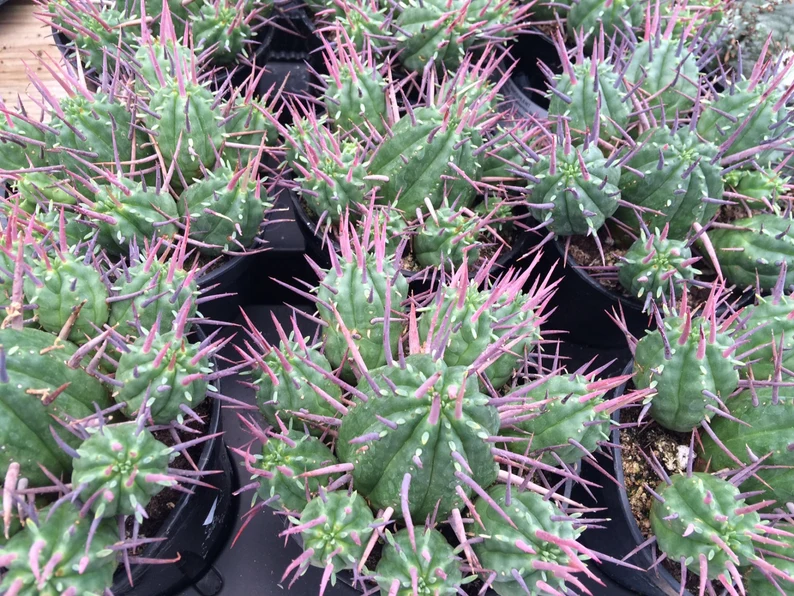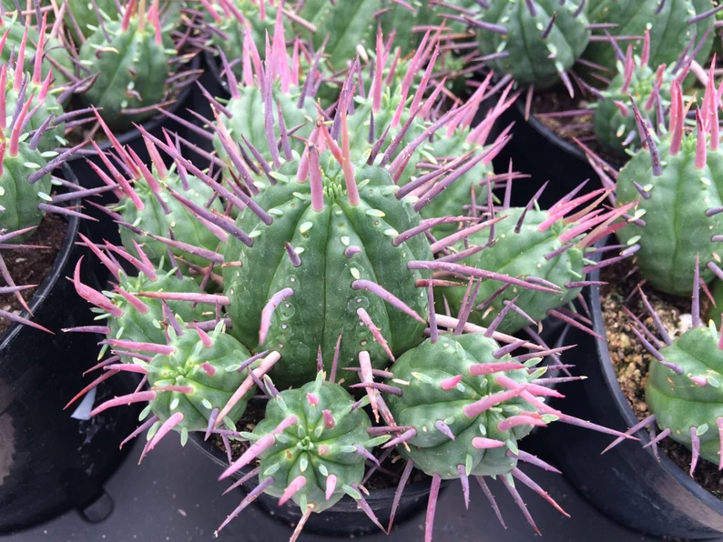 The Small Euphorbia Ferox is native to South Africa. This Euphorbia offsets freely to form clusters. It has very different and multi colored spines. Avoid contact with white sap from the interior of the plant. This unique Euphorbia has spines of purple and pink throughout most of the year when exposed to sunlight. They will turn brown during its dormant season and then will regain the coloring. Very drought tolerant. Create your own terrarium or centerpiece using ever-popular succulents.