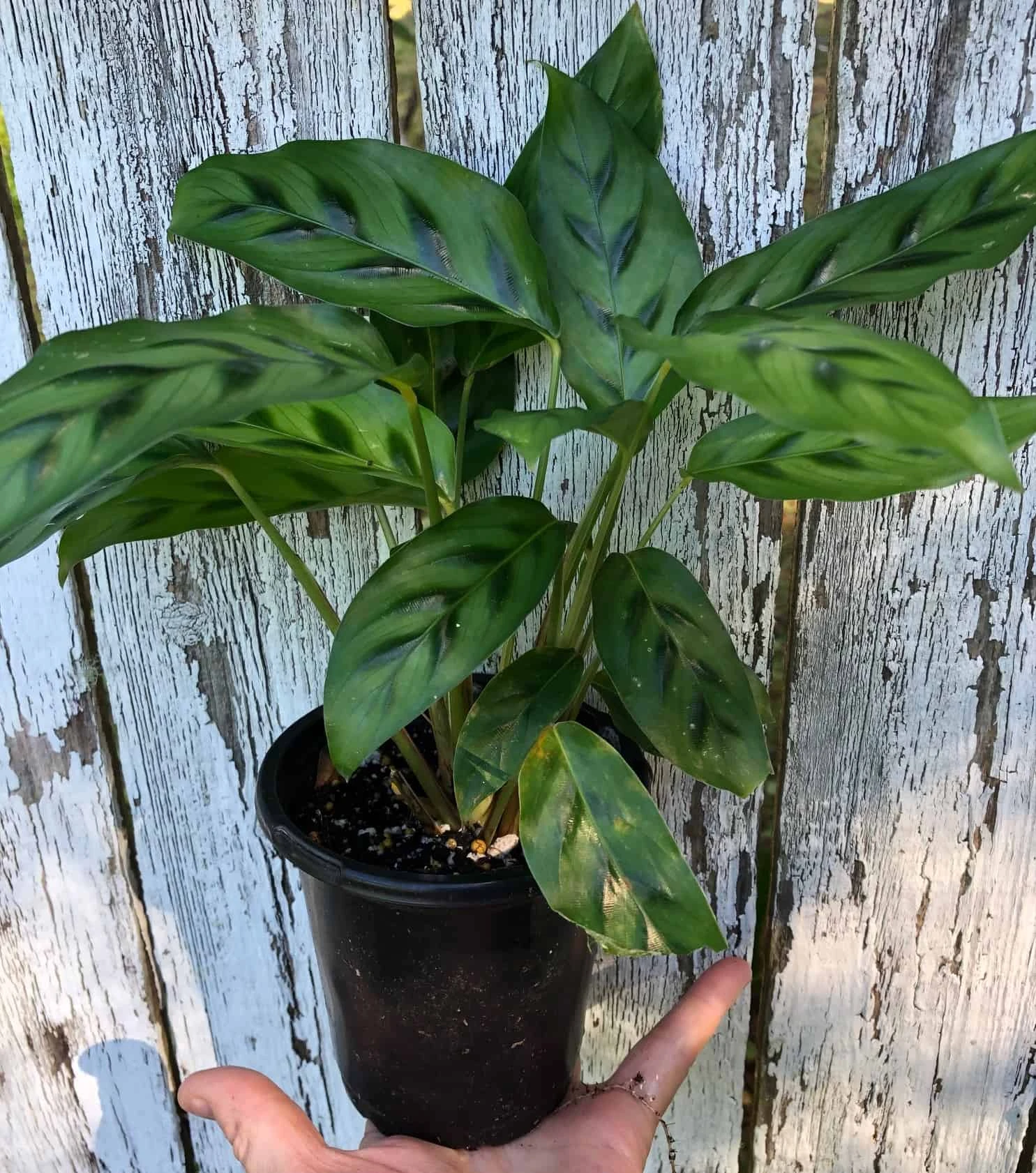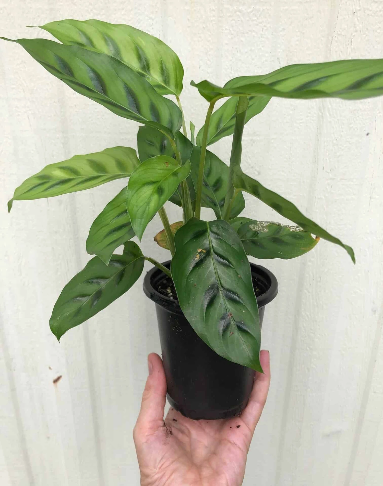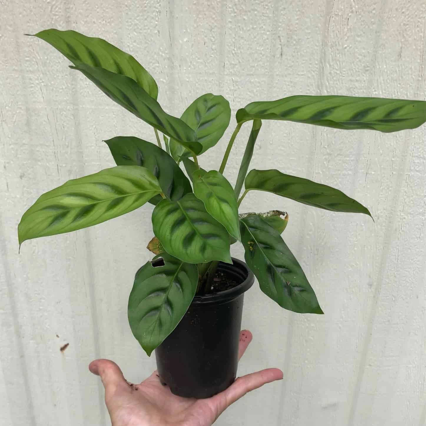 LIVE POTTED well rooted Calathea Leopardina plant, you will receive one live, well-rooted Calathea Leopardina plant potted with soil in a 4″ tall pot, ships in pot.