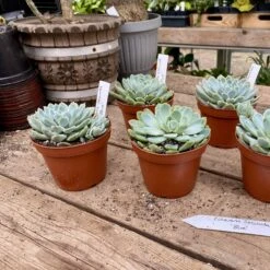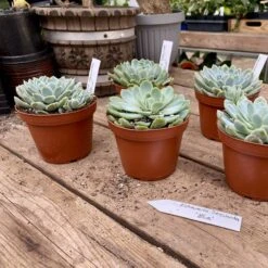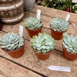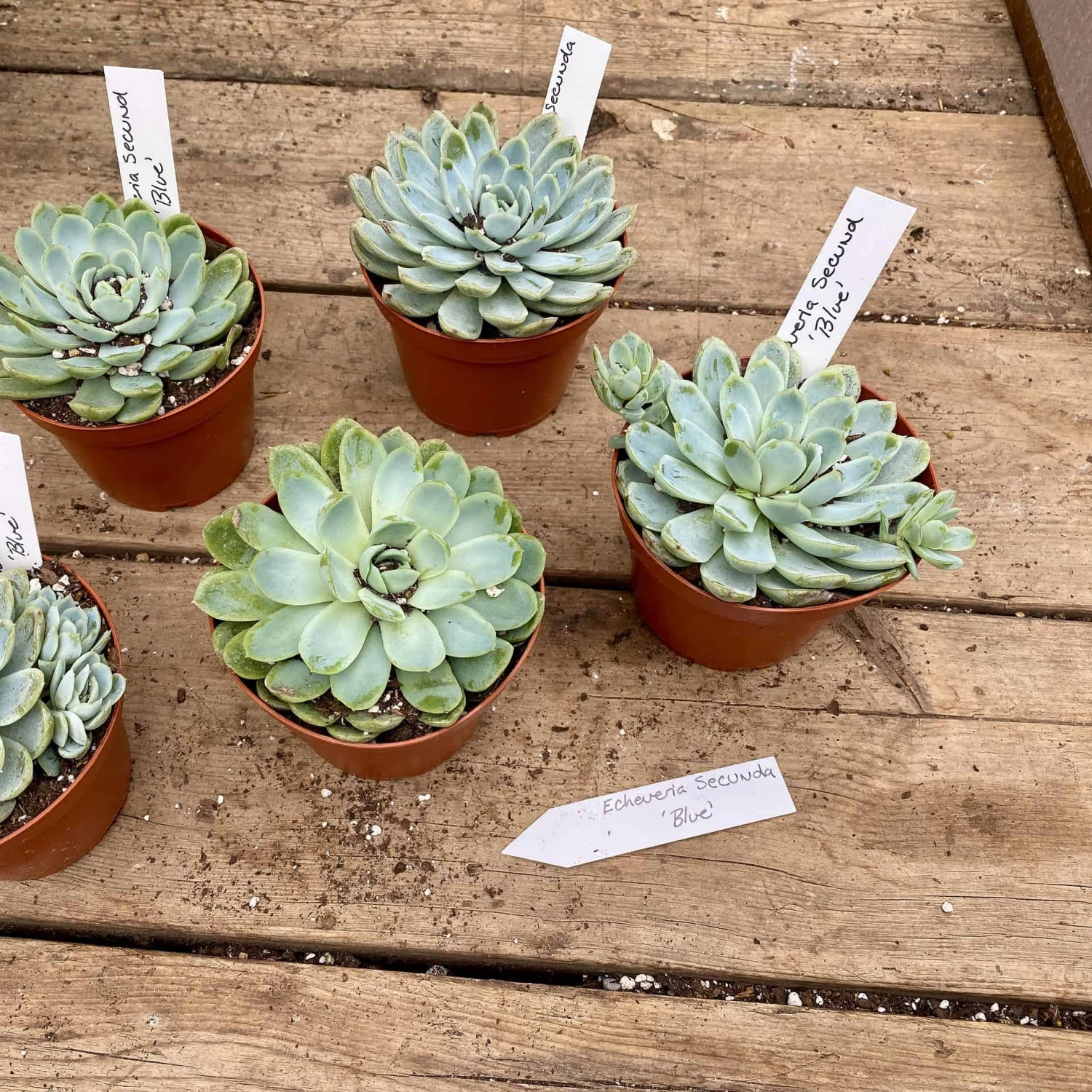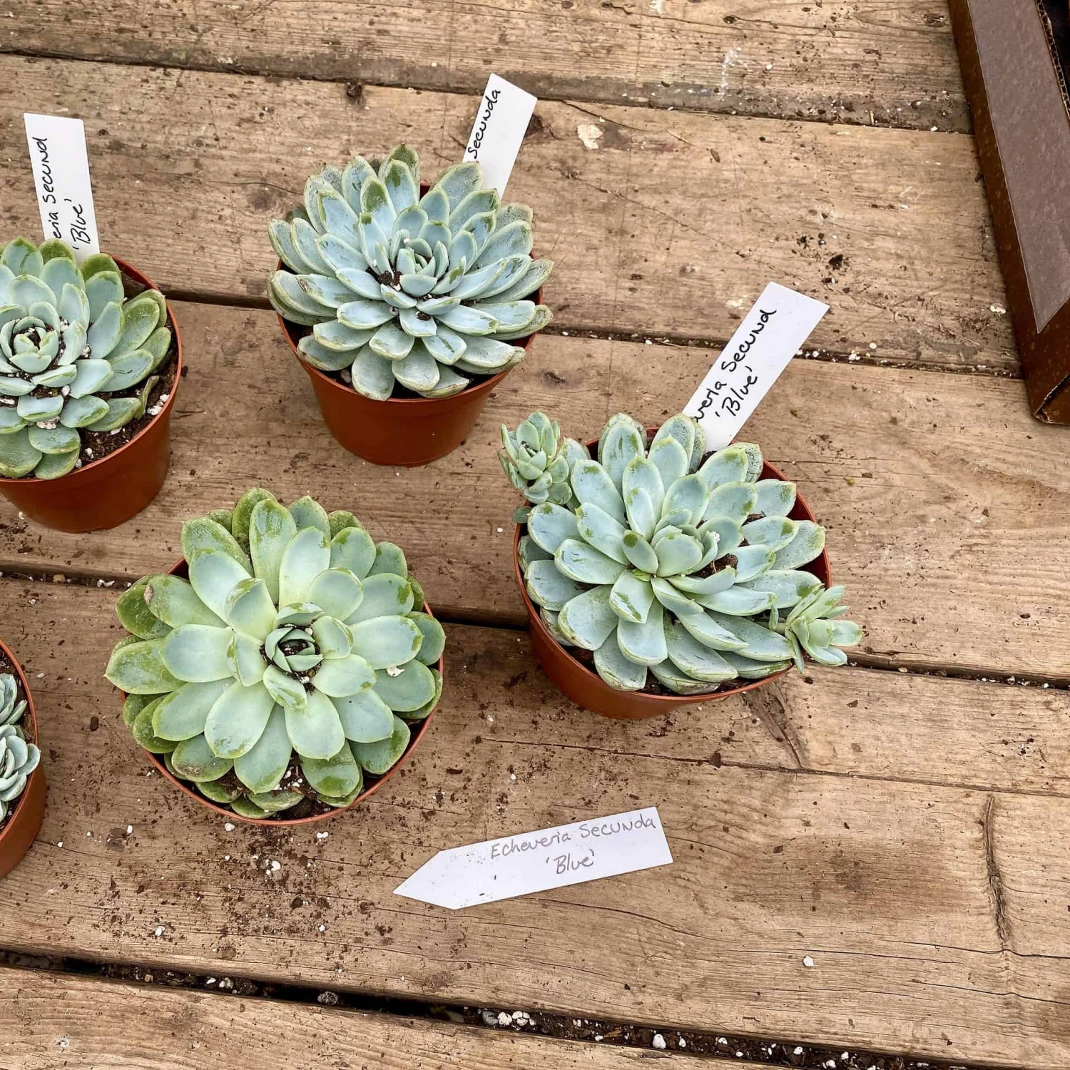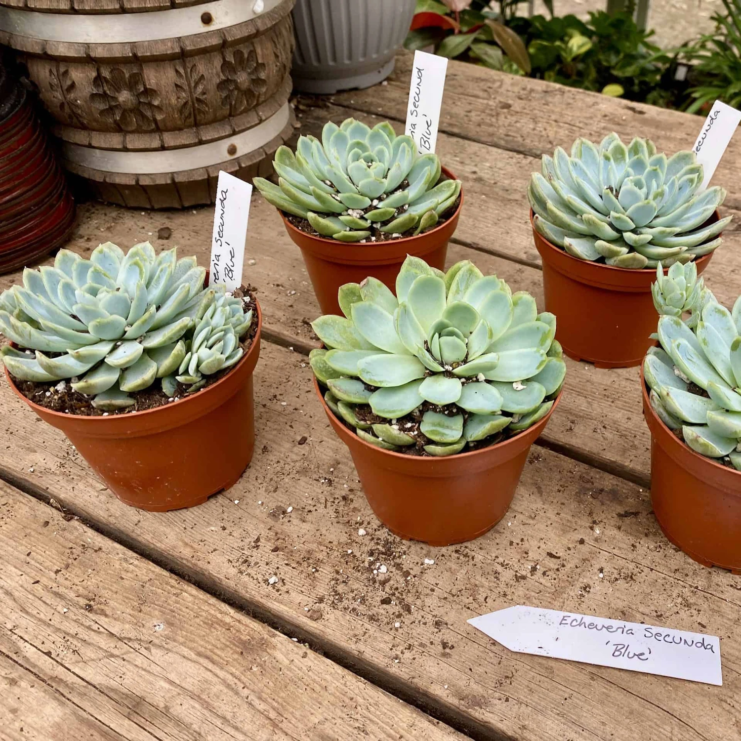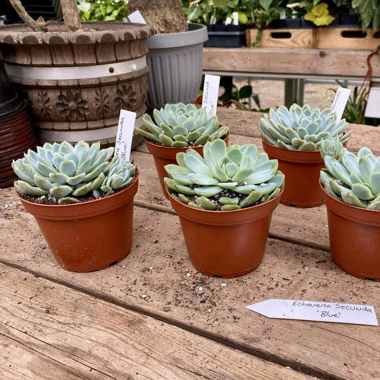 Blue Echeveria is a popular succulent native to Mexico in the stonecrop family. Its blue-green leaves grow in a tight rosette up to 6 inches across. It will readily make offsets that can be propagated when large enough. It will bloom with a 1-inch yellow flower in summer.