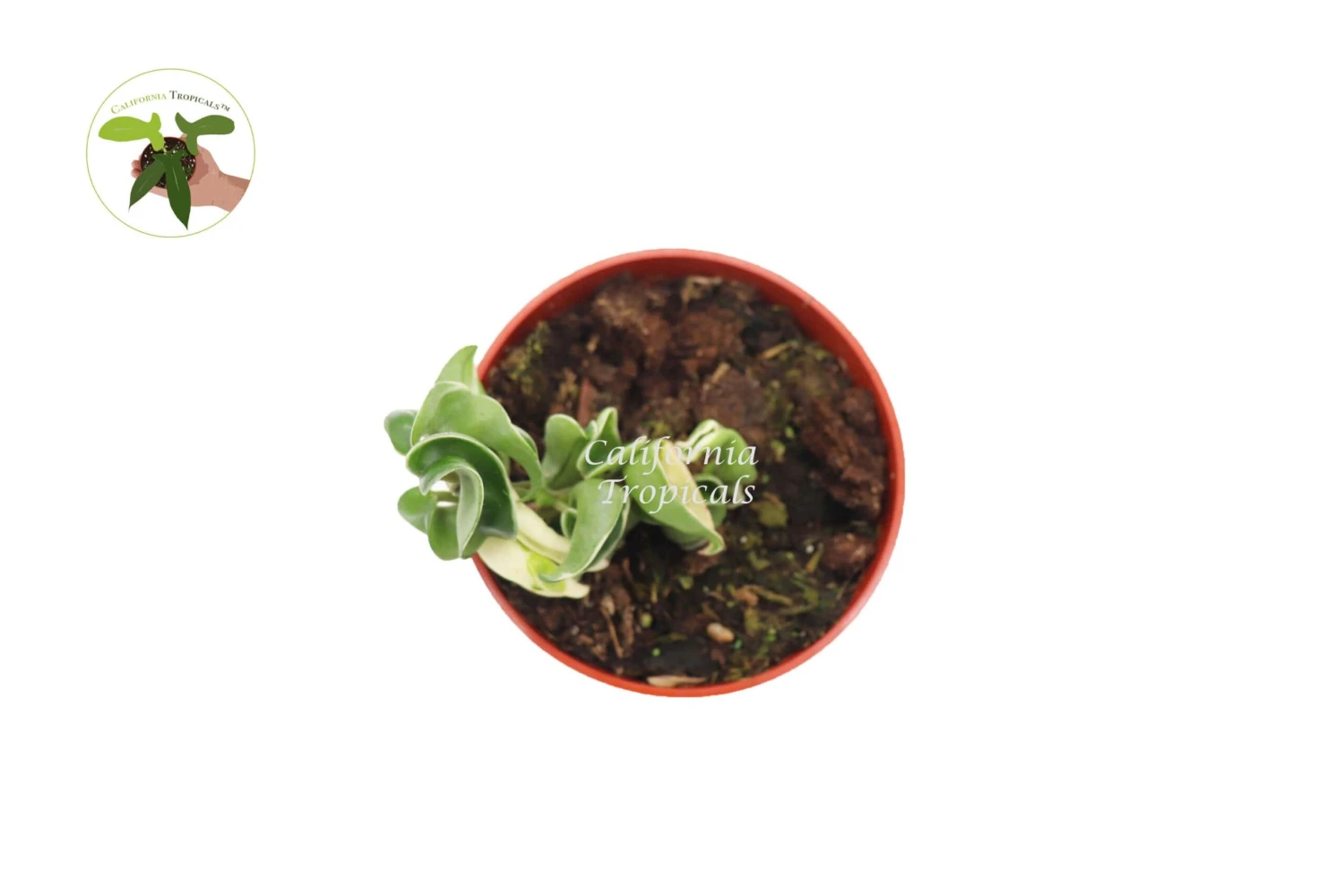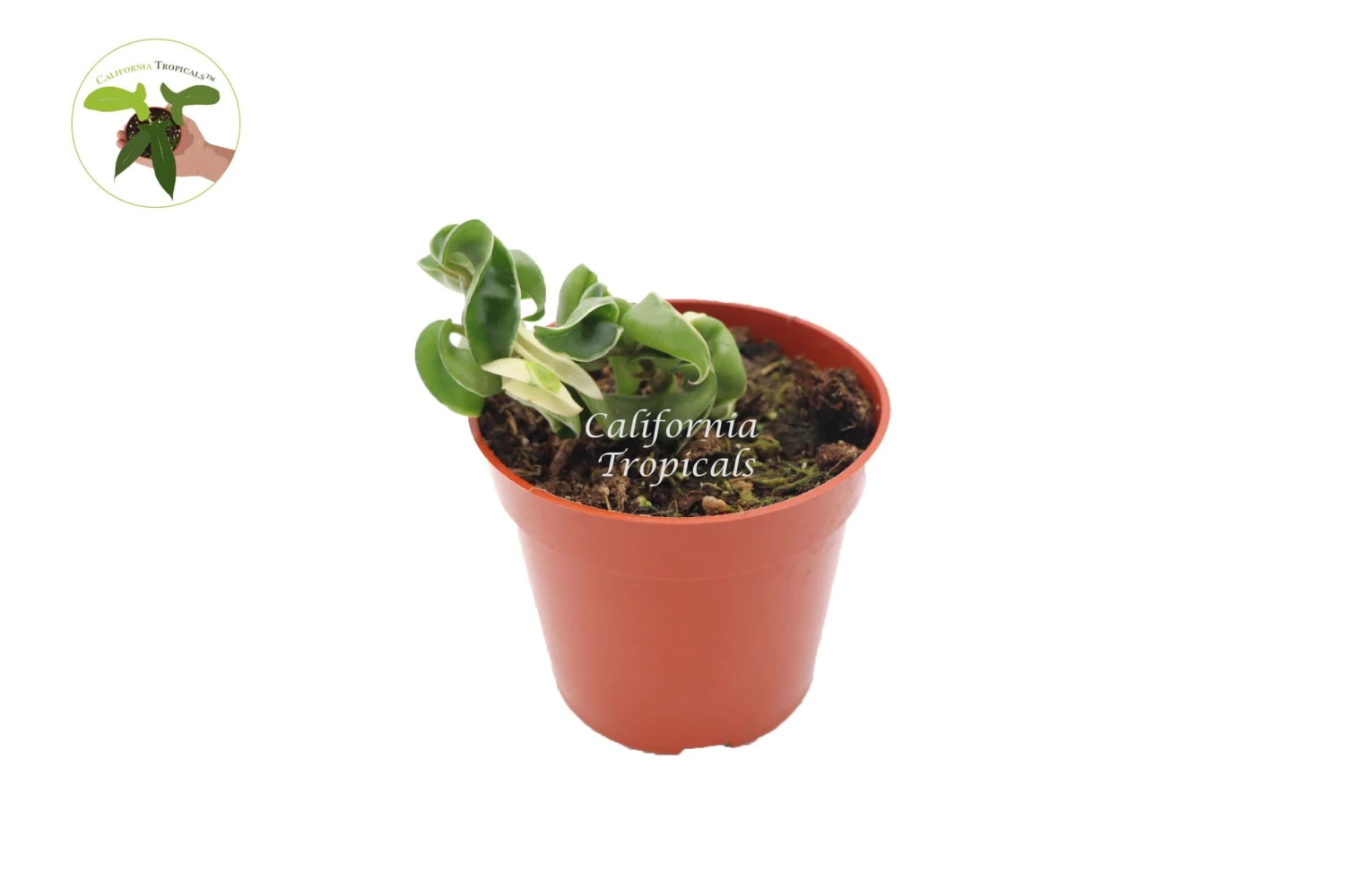 Hindu Rope Hoya Variegated has thick, waxy, twisted, curly, cupped leaves with variegated leaves of green and white margins. This succulent plant can produce clusters of star-shaped, waxy flowers as they mature. They are easy to grow and easy to care for once established.