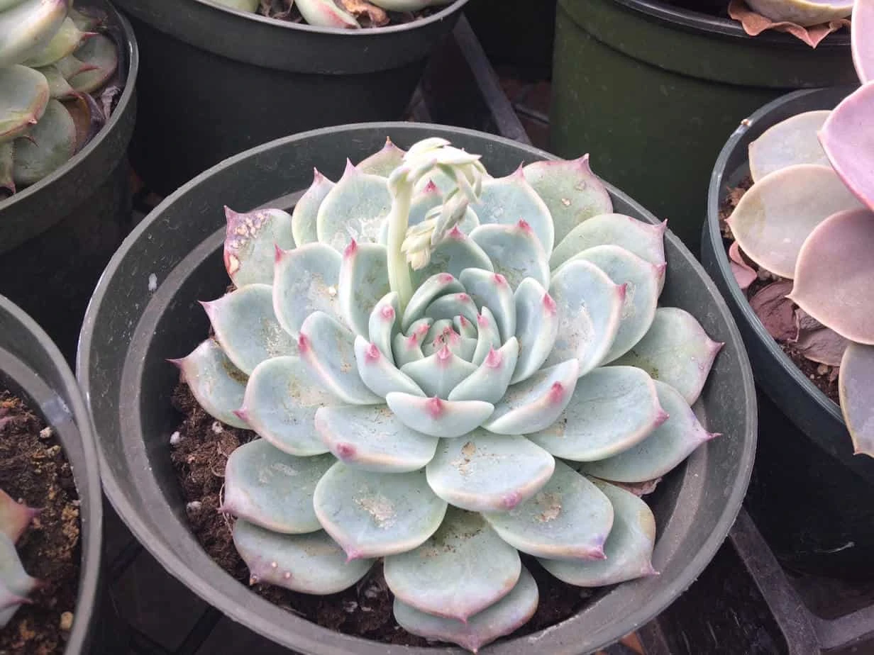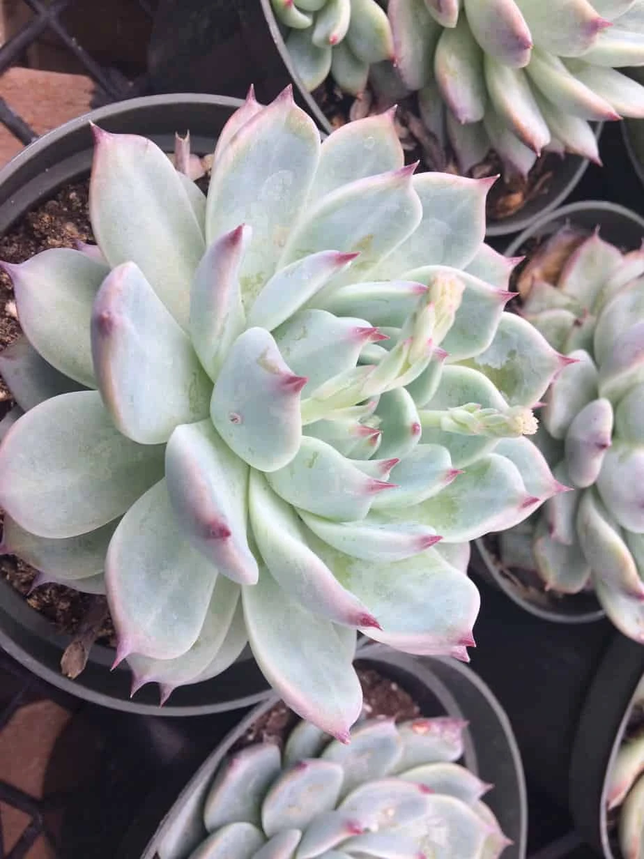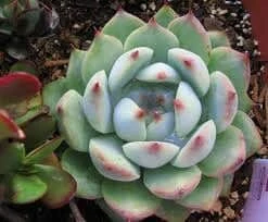 The succulent plant Echeveria Tippy forms low rosettes to 6 inches. Orange flowers attract hummingbirds. This plant is excellent for windowsills or rock gardens. Bright light is required to prevent “stretching” of Echeverias. This is a hybrid of E.colorata x E. cuspidata, which is called Echeveria Tippy or Echeveria Sunburst. Create your own terrarium or centerpiece using ever-popular succulents, or buy in bulk to use these as wedding or party favors–discounts are available for quantity purchases, just convo me for more info.