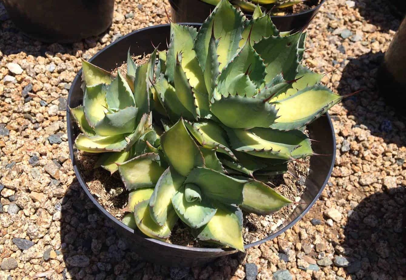 The Mature Agave Rum Runner or Agave Isthmensis is a gorgeous Agave. A broad, luminous, gold-yellow (rum colored) midstripe