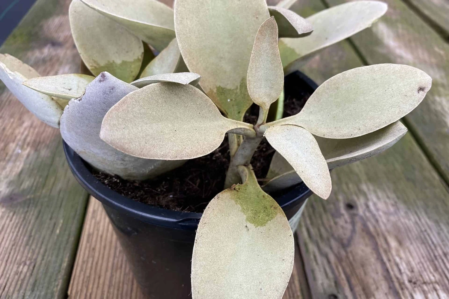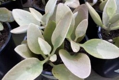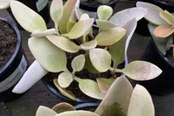 The Mature Kalanchoe Grey Ghost Plant is native to Madagascar. A sport of the favorite Copper Spoons, Grey Ghost displays no copper, but a soft, felty grey. It is unique and very rare. It is a tall, shrub-like succulent, but when grown in a container it does not reach the 6 foot that is possible when grown outdoors. It has stems and leaves that are densely covered with short, silvery/grey colored hairs. The leaves fold upwards from the middle. It is slow growing, but can reach 6 feet in height although it typically does not reach its maximum height. It produces small, yellow flowers. Provide sun on the coast to light shade inland. This plant is not cold hardy, so if you live in a zone that gets colder than 32 degrees it is best to plant this succulent in a container that can be brought indoors in the colder months. It does well in full to partial sun.