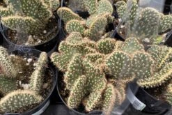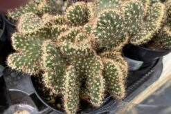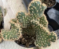 Medium Opuntia Parryi v. Serpentina Cristata is a very different and hard to find Opuntia. It is a vigorously growing crest of a smaller Opuntia. This unique plant is native to Baja California. It forms low growing clusters of a deep green. The fan like edges of this gorgeous Opuntia are marked with tan. The entire plant is also marked with tan speckles. The Parryi is somewhat cold tolerant to 32 degrees, but it is best to provide frost protection to prevent possible scarring. It will not tolerate extended freezing temperatures. Due to the rarity of this plant it is a must have for the serious collector.