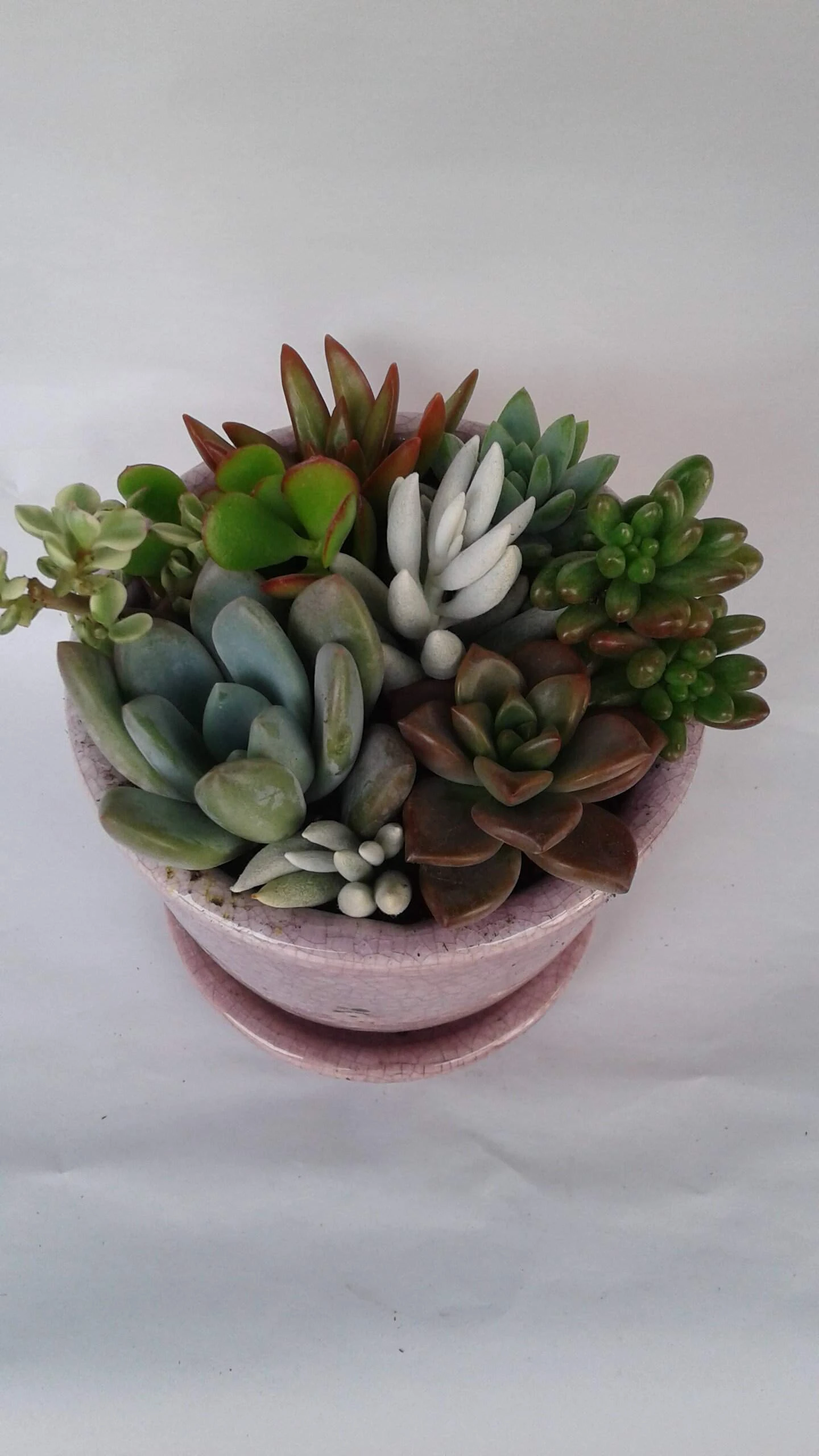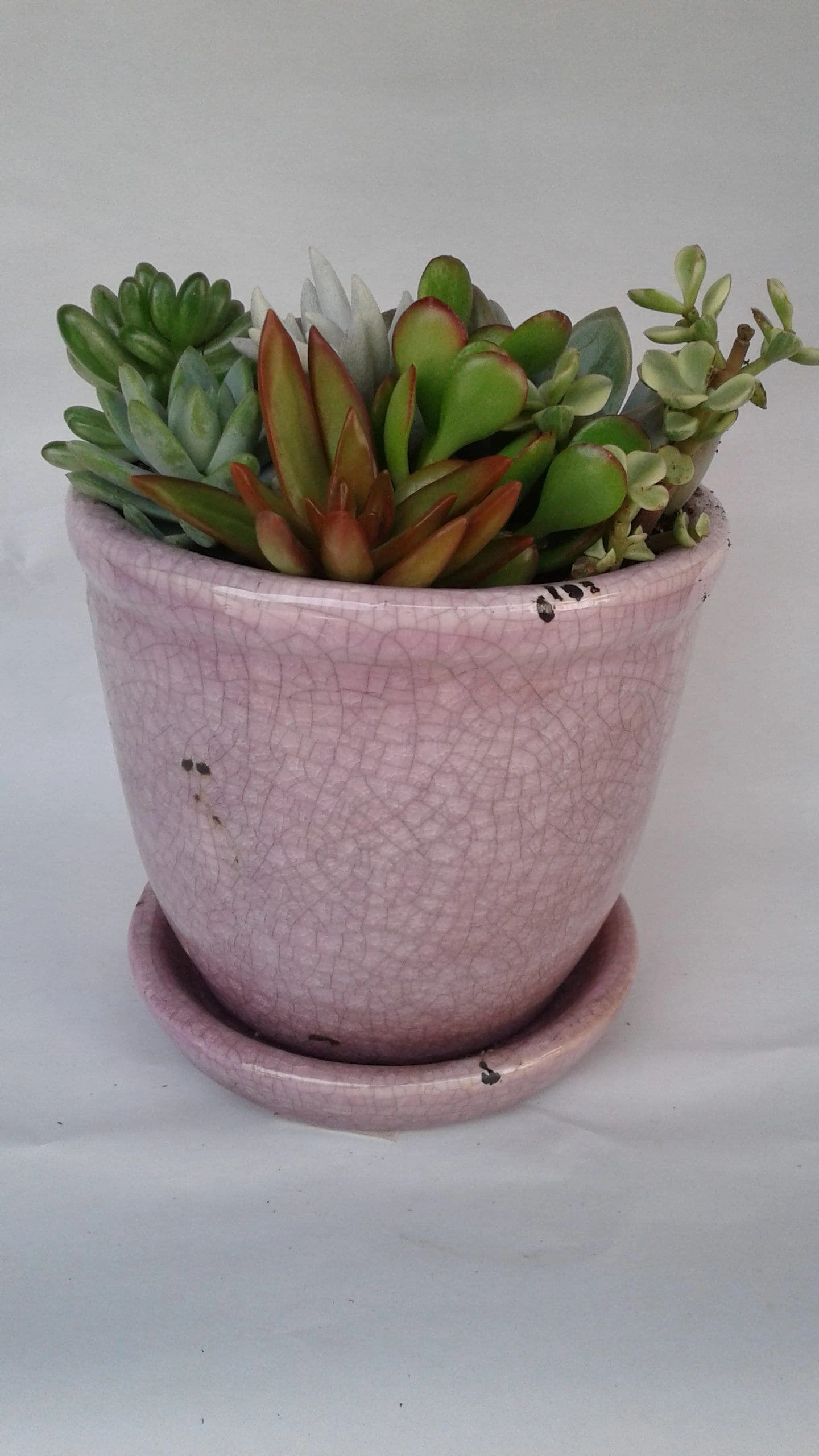 This is a beautiful, completely assembled medium dish garden. This arrangement is an assortment of a variety of succulents in a beautiful Violet/Pink Crackle Ceramic Glazed Planter with attached Drip Saucer. This dish garden is a wonderful Mother’s Day Gift, housewarming gift, hostess gift, a get well wish, a table centerpiece or a gift to yourself. It comes as shown, or with similar plants, depending on the season and availability. It measures 5″ tall with a 4’5″ diameter. These dish gardens are unique as they come as shown and no assembly is required. It is already complete, for you to enjoy! If this is being sent as a gift, please include whatever greeting or message you would like enclosed. A complete care sheet will be included. If you are ordering with temperatures of 34 degrees or less, please consider ordering a heat pack. You will receive one complete Violet/Pink Crackle Ceramic Glazed Planter with Attached Drip Saucer Planter fully assembled. It will be carefully wrapped for shipping and shipped via USPS Priority Mail. Please allow 7 days from placing your order for shipment.