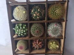 You will receive one Precision Cut, Shadow Box and Nine 2.5 inch cacti plants. The cacti will be shipped in their pots, placed into the individual openings.