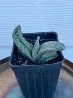 Gasteria āSakura FujiāĀ is a Japanese cultivar. It is a very attractive and desirable which should be in everyone gasteria collection. Leaves are thick and fleshy, tightly bunched, stacked, tongue-shaped, emerging from a center and fan out in opposing directions instead of forming a traditional rosette shape. Leaves are striated with tones of deep green, light green, gray, and white. A mature plants will reach a height of approximately 6 inches.