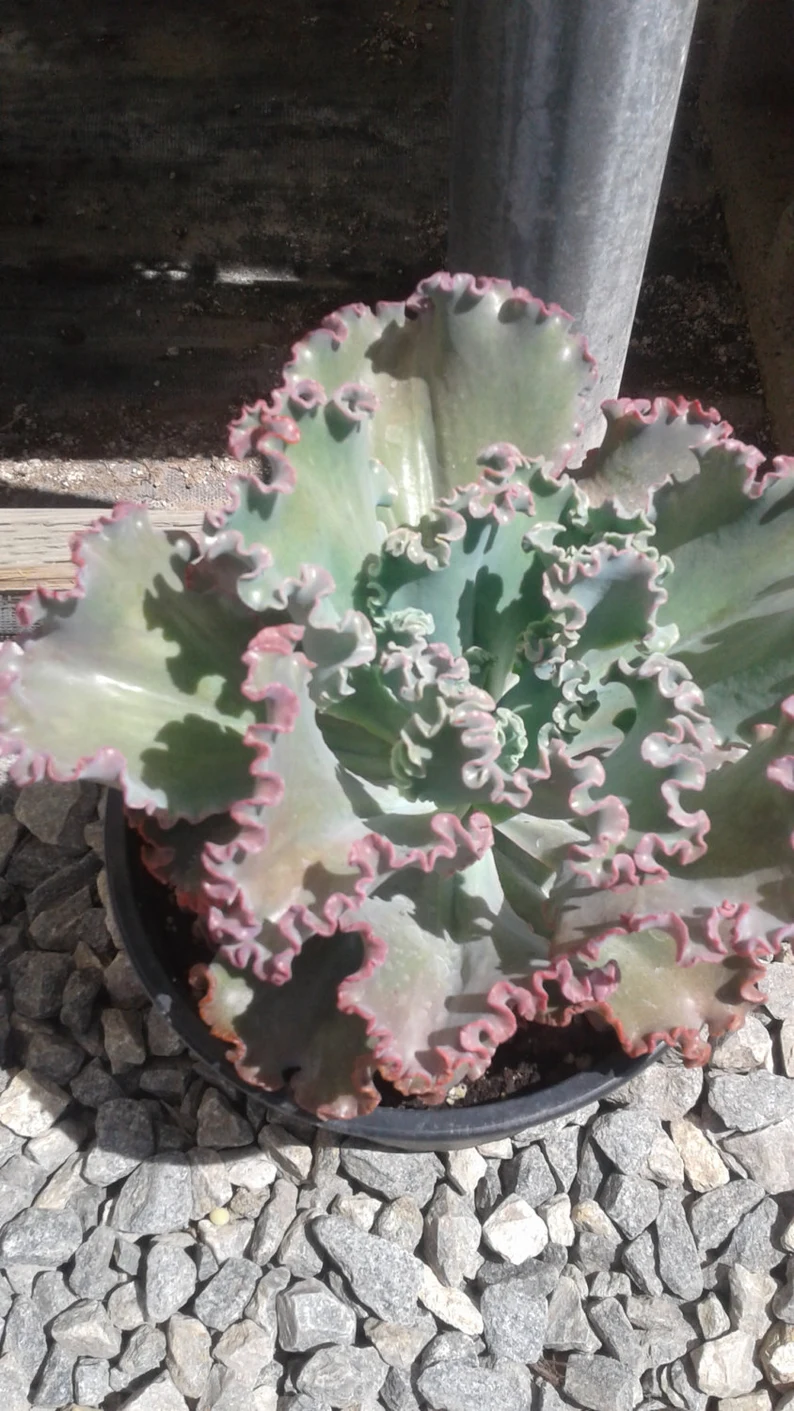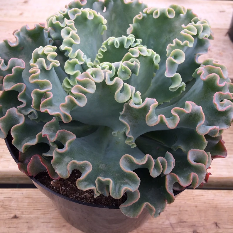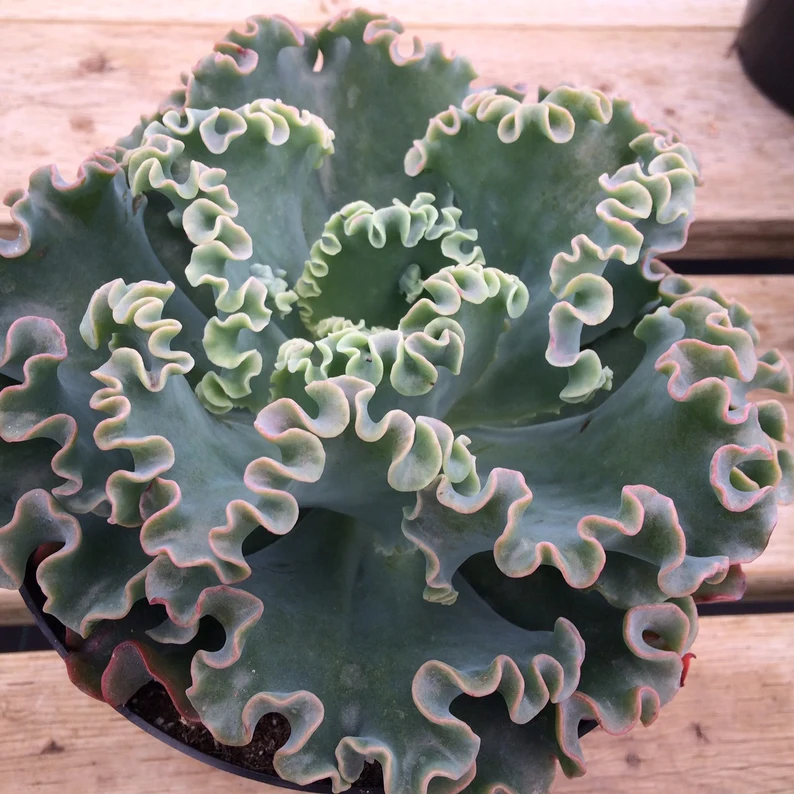The Mature Sea Dragon is a unique plant. It has beautiful coloring and is comprised of many layers of very curly petals. It is an absolutely beautiful specimen of a unique succulent. During the warmer weather it tends to be a little less curly and is edged with pink on the outer leaves. This is very limited species.