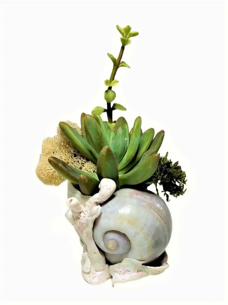 Small Seashell planter is loaded with desirable succulents. The shell is the perfect size for a teachers desk or office workspace ( 5″ x 5″). You just have to mist it 2-3 times per 7 days. When plants get to big, just trim or start a new collection. The shell does have a coral placement holder made from polymer. Gar-Zen Botanical Designs uses only organic plants that are never exposed to pesticides or harmful chemicals. We grow totally organic. Your planter comes in a giftbox ready to give. We always offer free shipping. Gar-Zen Botanical Designs is a Black and minority women owned business located in South Florida.
