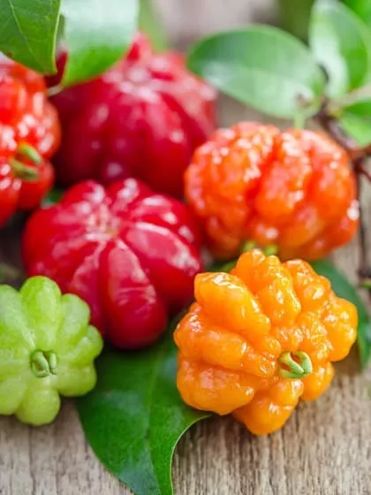 Small delicate white flowers are produced several times per year and you will often see flowers alongside fruit. Miniature pumpkin-shaped shiny, cherries are deeply lobed and begin green and transform through all shades of orange until they ripen at a bright deep red. When ripe the fruit is best enjoyed right as it’s picked.